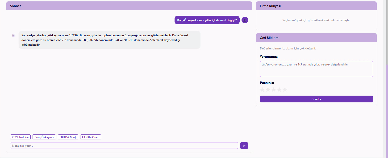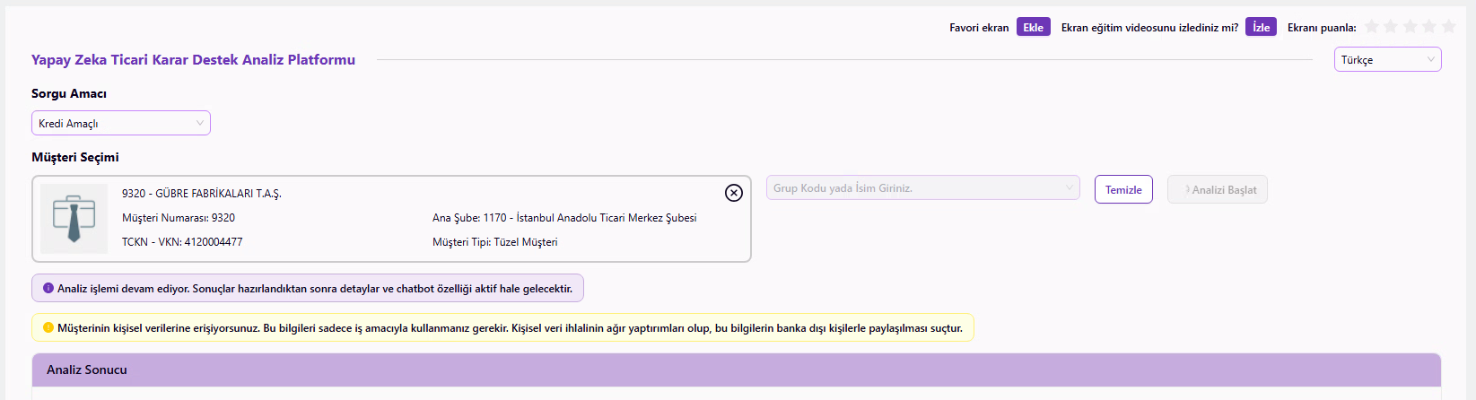 Corporate Insight AI projesi; kredi başvurusu yapan şirketlerin verilerini yapay zekâ analizleriyle değerlendiren ve böylece kredi tahsis ekiplerine akıllı karar desteği sağlayan veri odaklı bir sistemin geliştirilmesini kapsamaktadır. Projenin önceliği; kredi tahsis sürecindeki çok boyutlu ve karmaşık verileri merkezi ve bütünsel olarak sunarak, kredi ekiplerinin farklı kaynaklar arasında tarama yapma ihtiyacını ortadan kaldırmaktır. Kredi tahsis edilecek şirketin finansal skorlarından sektörel konumuna, rakip analizinden mali kırılgan noktalarına kadar pek çok kritik göstergenin analizi geleneksel yöntemlerle saatler sürebilecekken; Corporate Insight AI sayesinde, hızla işlenmekte ve insan gözünün fark edemeyeceği bağlantılarla da birleştirilerek kredi tahsis ekiplerinin ekranına bir dakikadan kısa bir sürede yansımaktadır. Hızın yanı sıra Corporate Insight AI’da en büyük fark, kredi tahsisi değerlendirme sürecine getirilen tarafsızlık ve tutarlılıktır. Ekiplerin manuel değerlendirmelerinde kaçınılmaz olan kişisel yorum ve tecrübe farklılıkları, yapay zekânın tutarlı modelleme yeteneğiyle standart hale getirilerek kredi tahsis süreçlerinde bölge ve genel müdürlük birimleri arasında tam bir metodolojik uyum yakalanmaktadır. Corporate Insight AI kapsamında operasyonel verimlilik interaktif bir deneyimle de iyileştirilir. Sisteme entegre sohbet modülü sayesinde ekiplerin kredi verilecek şirket verilerine dair ihtiyaca yönelik soru sorması ve yapay zekâ destekli anlık yanıtlar alması sağlanır.
