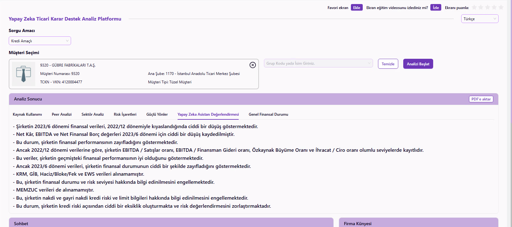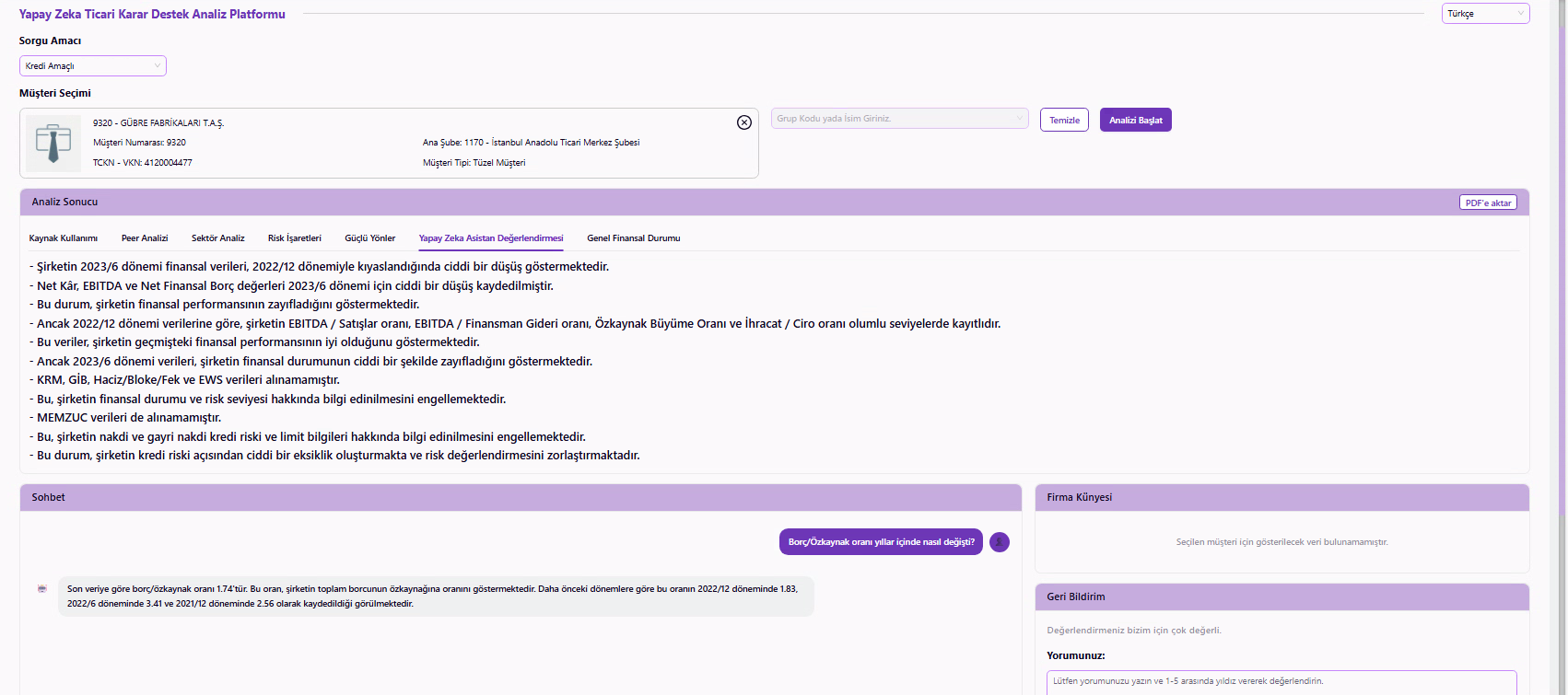 Corporate Insight AI projesi; kredi başvurusu yapan şirketlerin verilerini yapay zekâ analizleriyle değerlendiren ve böylece kredi tahsis ekiplerine akıllı karar desteği sağlayan veri odaklı bir sistemin geliştirilmesini kapsamaktadır. Projenin önceliği; kredi tahsis sürecindeki çok boyutlu ve karmaşık verileri merkezi ve bütünsel olarak sunarak, kredi ekiplerinin farklı kaynaklar arasında tarama yapma ihtiyacını ortadan kaldırmaktır. Kredi tahsis edilecek şirketin finansal skorlarından sektörel konumuna, rakip analizinden mali kırılgan noktalarına kadar pek çok kritik göstergenin analizi geleneksel yöntemlerle saatler sürebilecekken; Corporate Insight AI sayesinde, hızla işlenmekte ve insan gözünün fark edemeyeceği bağlantılarla da birleştirilerek kredi tahsis ekiplerinin ekranına bir dakikadan kısa bir sürede yansımaktadır. Hızın yanı sıra Corporate Insight AI’da en büyük fark, kredi tahsisi değerlendirme sürecine getirilen tarafsızlık ve tutarlılıktır. Ekiplerin manuel değerlendirmelerinde kaçınılmaz olan kişisel yorum ve tecrübe farklılıkları, yapay zekânın tutarlı modelleme yeteneğiyle standart hale getirilerek kredi tahsis süreçlerinde bölge ve genel müdürlük birimleri arasında tam bir metodolojik uyum yakalanmaktadır. Corporate Insight AI kapsamında operasyonel verimlilik interaktif bir deneyimle de iyileştirilir. Sisteme entegre sohbet modülü sayesinde ekiplerin kredi verilecek şirket verilerine dair ihtiyaca yönelik soru sorması ve yapay zekâ destekli anlık yanıtlar alması sağlanır.
